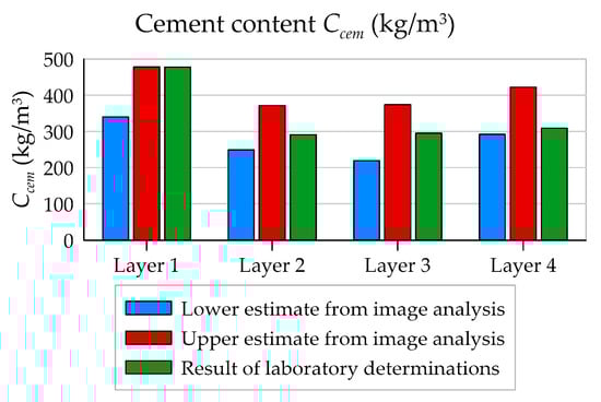 The specified ranges in Table 7 are quite wide; however, in terms of quality, cement content is “well rendered”, i.e., the smallest values are in the middle layers (No. 2 and 3), and the highest value is in the inner one (Layer 1) (see Figure 20).