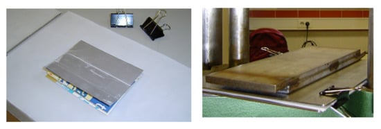 After selection and cleaning operations of the raw material, an operation of heating of the samples in a furnace (Chesa Model 1200 °C max. (Madrid, Spain)—Figure 3a) was made at the temperatures and elected times. Next, the boards (85 mm × 115 mm) were pressed at elected pressures, corresponding to the different groups (Table 1). In the warm pressing operation (Universal Pressing Machine Model Nestor 10 Tn. max. (Madrid, Spain)—Figure 3b), teflon sheets were used to avoid the adhesion between PE and the steel-pressing parts. Figure 4 represents the group of operations to obtain the test parts.