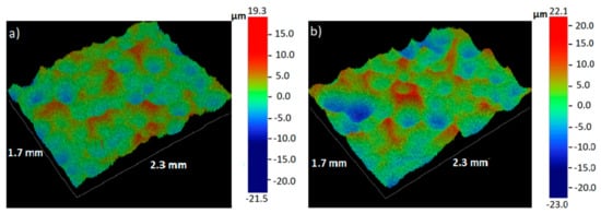 Figure 1 presents the surface morphology of magnesium samples after 60 s and 120 s of SMAT. On both surfaces, there are visible craters formed due to the impacts of steel shots during the treatment. The roughness parameter Ra increased from the initial value of about 1 μm to 3.37 μm and 4.63 μm for 60 s and 120 s of SMAT duration, respectively. It is known that the extent of the roughness increase in SMAT depends on the ball type and size, the treatment time, and the vibration amplitude [,]. The higher roughness caused by the higher vibration amplitude was reported, e.g., for stainless steel []. The surface roughness values obtained in this study are similar to those obtained by Laleh and Kargar for AZ91D alloy SMATed for 30 min with stainless steel balls with a similar diameter []. However, they are higher than those reported by Li et al. for pure magnesium and Mg–1Ca alloy SMATed with zirconia balls (2 mm in diameter) over a range of times from 40 to 90 min []. It is worth mentioning that the dependence of the surface roughness on the SMAT duration does not necessarily have to be monotonic. Kargar et al. reported that the surface roughness of copper initially increased sharply and decreased slightly with the increasing treatment time from 10 to 300 min [].