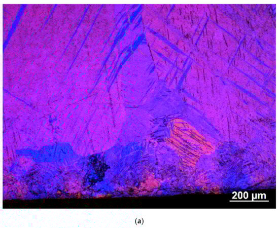 The microstructure was examined using optical microscopy with polarized light and the EBSD technique. These studies were performed on the sample cross-sections perpendicular to the SMATed surface. Typical images, shown in Figure 2, were selected from results obtained for the sample treated for 120 s. A significant decrease in the grain size and the presence of characteristic twins belonging to different twinning systems in which density gradually decreases with a distance from the treated surface can be seen. The SMAT affected microstructure extends to a depth of about 800–900 μm. This result corresponds well to the thickness of the hardened layer (see Section 3.3). Directly at the surface up to the depth of 200 µm, the density of twins is very high. In this subsurface layer up to the depth of about 80 µm, some very small twin free grains are present. Based on EBSD results, their size can be estimated as less than 10 μm. The presence of finer grains cannot be excluded, but their unambiguous identification requires a more resolved research technique (i.e., transmission electron microscope). The same type of microstructure was formed in the sample treated for 60 s, but, in this case, the fine twin free grains were not observed. Another difference concerns the estimated density of the twins and the SMAT affected layer’s depth, which was smaller for shorter SMAT duration with the lower vibration amplitude due to the lower energy imparted to the surface. The same type of microstructure was reported in the literature for some SMATed metals with the hexagonal close-packed structure (hcp) [,,,].