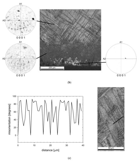 At a high strain rate at room temperature, mechanical twinning is the main deformation mode of hcp metals, such as magnesium and titanium, especially when the strain is not too high []. Twinning can be responsible for the grain refinement and results in strain hardening. Twins produce characteristic misorientations of the crystal lattice, and such misorientations were used in the present research to identify twins (see Figure 2) [].