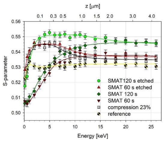 To confirm this, we etched the samples in Nital to remove the oxide layer, and the measurement was repeated. The additional measurement was performed for the sample compressed to the thickness reduction of 23%. Note, however, that due to the high reactivity of magnesium towards oxygen, a thin oxide layer will be spontaneously formed at the surface after removal of the sample from the solution. All etched samples exhibit the S-parameter dependencies of a similar shape, which significantly differ from those obtained for the samples before etching. The S-parameter values at the surface are higher than before etching. The S-parameter increases for the positron energy up to 5 keV for the 120 s SMATed sample and 2 keV for the 60 s SMATed and compressed samples. There is a visible broad maximum, after which the S-parameter decreases to the saturated values obtained for the samples before etching. Therefore, one can conclude that the saturated values of the S-parameter correspond to the annihilation of positrons in the metal matrix of the samples. The S-parameter values higher than those for the metal matrix of the samples may indicate the presence of open volume defects induced by etching, as shown, for example, for aluminum [,]. The broader maximum and the higher values of the S-parameter for the sample SMATed 120 s compared with the sample SMATed 60 s suggests a higher concentration of defects and, therefore, a higher reactivity of the former sample.