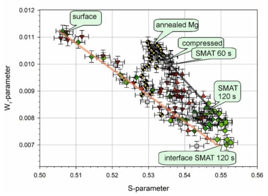 Information about the type of defects in all samples can be revealed by the Wr- versus S-parameter plot, as shown in Figure 6 [,]. Generally, a straight-line segment in such plots indicates that only two positron states contribute to annihilation. The end points of this segment correspond to phases or defects having particular S- and Wr-parameters. It seems that the points in Figure 5 for which an increase of the S-parameter starts at the surface lie along a straight line in Figure 6. For higher values of the positron incident energy, the points deviate from this straight line. Yang et al. observed similar behavior for AM60B magnesium alloy after immersion in NaCl solution for the initial sample and short immersion times []. It was explained as caused initially by the presence of an oxide layer and then a corrosion product layer, whose thickness increases with the increase of the immersion time, and an interface between this layer and the metal matrix. In our case, the states from which positrons annihilate in the metal matrix of the samples SMATed for 60 s and 120 s, and the compressed sample may differ because of different kind and amplitude of deformation and possibly different kind and density of defects. However, it can be seen that the points for which the S-parameter values saturate in Figure 5 are gathered in three locations in Figure 6: The first is described as bulk for the 120 s SMATed sample, second as bulk for the 60 s SMATed sample, and third as bulk for the compressed sample. The difference between the two latter is small. Furthermore, these three locations and the points for annealed Mg also lie along another straight line, which suggests that defects in the metal matrices of the samples are similar, and only their concentration changes.