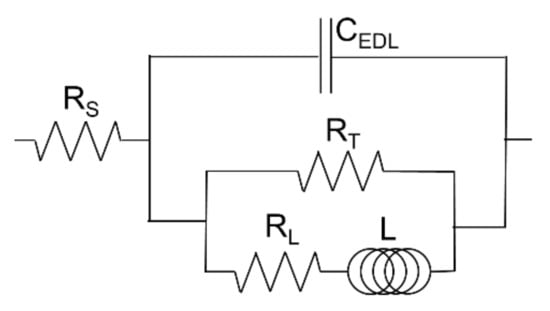 Equivalent electrical circuit applied in the interpretation of the data from electrochemical impedance spectroscopy measurements. RS = resistance of the solution, CEDL = capacitance of the electrical double layer, RT = charge-transfer resistance, L = inductance of the electrode process, RL = resistance connected with the inductance of the electrode process.
