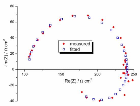 For the equivalent electrical circuit (EEC) showed in Figure 7, the polarization resistance, i.e., the parameter characterizing the susceptibility of a material to corrosion, may be calculated from the formula: