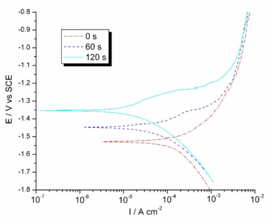 Linear sweep voltammetry on the Mg sample not subjected to any treatment (reference sample), the samples SMATed for 60 s and 120 s in 0.15 mol dm−3 NaCl solution saturated with Mg(OH)2 at the potential sweep rate of 1 mV s−1.