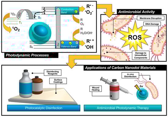 Schematic description of antimicrobial photodynamic therapy and photocatalytic disinfection using carbon nanodots.