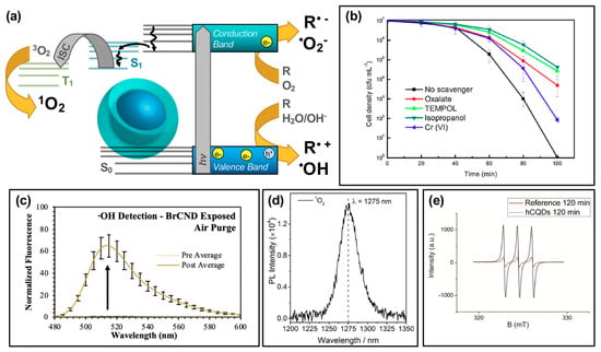 The Type II photosensitization product known as singlet oxygen has also been investigated as a potential product from carbon nanodot photosensitizers [,,,,], shown in the simplified Jablonski diagram of Figure 3a. In this regime, carbon dots can be considered as small molecule fluorophores; triplet character of the carbon dots is therefore a strong factor in the ability of singlet oxygen to be generated. While the long lifetime inherent of triplet excited states provides a larger window of opportunity for diffusing oxygen to interact with the photosensitizer, thereby undergoing energy transfer and generating singlet oxygen, there is also the possibility that other diffusing species or even competitive radiative decay pathways such as alpha/delayed fluorescence may deactivate the excited triplet state without the production of singlet oxygen. Nonetheless, singlet oxygen has been detected by carbon dot photosensitization. In a study by Zhang et al., singlet oxygen was directly detected from their carbon dot structures by measuring the phosphorescent emission of singlet oxygen, observable at ~1270–1275 nm (Figure 3d) []. Singlet oxygen has also been detected from brominated carbon nanodots using the singlet oxygen specific fluorescence-on probe Singlet Oxygen Sensor Green™ [], and by electron paramagnetic resonance measurements, as shown for hydrophobic carbon quantum dots (hCQDs) from a study by Stankovic et al. in Figure 3e []. These authors additionally measured the quantum yield of the hCQDs using tetraphenylporphyrin as a standard, arriving at a value of 0.31. They note that although this does not match the efficiency of fullerenes (0.86), carbon dots themselves do not quench singlet oxygen and therefore are a promising scaffold to adapt and apply as a photodynamic antimicrobial agent []; this is advantageous versus the Type I mechanism, as carbon dots have been shown to behave in some instances as radical scavengers with antioxidant behavior []; it should also be noted that unlike Type I products, which can result from charge transfer to a variety of reactants, singlet oxygen generation is dependent specifically upon the availability of oxygen in the system, with reported loss of detection under oxygen-depleted conditions being shown in several studies for carbon dot materials [,].