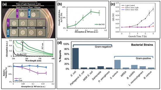 Photodynamic antimicrobial characteristics of carbon nanodots. (a) Top—Concentration-dependent growth reduction of Staphylococcus aureus exposed to brominated carbon nanodots (BrCND). Middle—Absorption spectra for BrCND of varying concentrations, corresponding to solutions used in top panel. Bottom—Relative viability of bacterial samples under both dark and light-exposed conditions (from Reference []). (b) Photodynamic inhibition of bacterial growth from (a) (from Reference []). (c) Bacterial growth curves of Escherichia coli samples after photodynamic treatment with carbon nanodots (EDA-C-dots). (d) Summary of investigated bacterial strains in the references reported by this review. For additional details regarding the reported studies, the reader is referred to Table 1 of the main text. Abbreviations: CDs (carbon nanodots). Permissions: (c) Adapted with permission from Reference []. Copyright © 2016, American Chemical Society.