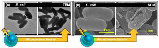 In some instances, morphological changes were also examined in conjunction with the viability studies from colony growth, disk diffusion assays, and/or growth curves. Morphological changes in fact are expected as part of a photosensitization mechanism, as ROS have been shown to act upon and severely compromise bacterial membranes; carbon dots specifically have been noted to induce lipid peroxidation, as mentioned previously. Examples of this phenomenon are shown in Figure 5, reported both by TEM (Figure 5a) and scanning electron microscopy (SEM, Figure 5b) for different studies. In the former case (Figure 5a), E. coli cells were exposed to visible light for one hour, both with and without 5 μg/mL of carbon nanodot sample in a 2018 study by Dong et al. []. Interestingly, when examined in terms of colony growth, the carbon dot sample alone at this concentration was insufficient to induce cell death under photosensitization conditions. Only at higher concentrations (25+ μg/mL) were antibacterial photosensitization effects observed. Yet upon examination of the TEM images, it is clear that even at low concentrations the carbon dot samples begin to have deleterious effects on bacterial morphology. In a report by Kavitha et al., the morphology of E. coli cells was also studied, this time using SEM (Figure 5b) []. In this case, cells were treated with 70 μg/mL of carbon dots; the left-hand image displays the cells before photodynamic treatment, while the right-hand image displays the effects after a 10 h exposure period with room light. Significant differences in morphology are observed here, including membrane wrinkling and even rupture. Although the 10 h exposure interval shown here does in fact seem quite lengthy, the authors do additionally note a significant impairment of growth (monitored by OD590) after as little as 1 h exposure compared to the untreated control. Morphology changes have also been reported for Gram-positive bacteria treated with carbon dot photosensitizers including S. aureus [].