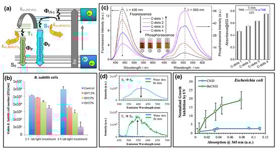 where the “quantum yield” of ISC to form the excited (emissive) triplet state is given by ΦISC. It becomes obvious then that phosphorescence quantum yield may be considered for antibacterial applications in a similar way to “Case 2” fluorescence quantum yield discussed earlier. By improving ΦISC of a species, a more excited triplet character can be achieved. Given the unique triplet-triplet interaction possible between these excited states and ground-state oxygen, optimization of triplet character from carbon dots is a natural avenue to improve antibacterial efficiency. The phosphorescent quantum yield is an effective measurement to probe triplet character in a photosensitizer; this is particularly true as phosphorescence detection typically requires fixation in a matrix [] or minimization of oxygen diffusion [] since oxygen so readily quenches radiative decay from triplet excited states. This necessitates essentially the removal of knr,ROS(T1) as a possible decay pathway such that phosphorescence can be observed. It can then be assumed that a photosensitizer displaying a strong phosphorescent signal will also likely interact strongly with oxygen to form ROS, since (for detection) knr,ROS(T1) is mitigated. This has in fact been confirmed by both Zhang et al. [] and by us [], using different synthetic avenues to achieve phosphorescent carbon dot structures. Work by the former is displayed in Figure 6c; using hydrothermal polymerization of citric acid and ethylenediamine, the authors obtained carbon dot samples of differing phosphorescence quantum yields. As shown by the luminescence spectra, as fluorescence intensity decreases for these samples, phosphorescence intensity inversely increases, consistent with the photophysical mechanism of phosphorescence. To probe the generation of singlet oxygen, the authors monitored the colorimetric probe 3,3′,5,5′-tetramethylbenzidine (TMB), which upon oxidation by singlet oxygen increases in absorption at 652 nm. The results of this study are presented in Figure 6c (right). It is clear that the degree of TMB oxidation, and therefore singlet oxygen production, correlates also to the carbon dot phosphorescence quantum yield. The authors indicate that the overall nitrogen content in their carbon dot structures is likely the source of the phosphorescence differences, and therefore presents a strategy for phosphorescence optimization in other carbon dot syntheses [,].