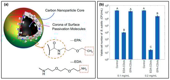 Surface charge effects on antimicrobial activity. (a) Schematic showing the surface passivation agents used to tune the surface charge of carbon nanodots, whereby 2,2-(ethylenedioxy)bis-(ethylamine) (EDA) confers a positive charge and 3-ethoxypropylamine (EPA) a neutral charge at pH 7.4. (b) Viability of Bacillus subtilis cells following photodynamic treatment with EDA- and EPA-conjugated carbon dots (EDA/EPA-CDots). The control consists of the light-exposed samples in the absence of carbon dot treatment. Statistical difference is indicated by the letters (A–C, p < 0.05); data with the same letter label have no statistical difference. For additional details regarding the reported studies, the reader is referred to Table 1 of the main text. Permissions: (a,b) Adapted from Reference []. Open access.