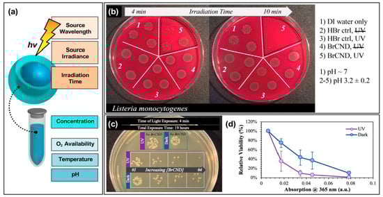 These can be considered to fall into roughly two categories: variables of excitation or “solution” (in this case, used to refer to the experimental environment) conditions. For the former, aspects such as the excitation wavelength, the source irradiance or power, as well as the irradiation time will all influence the observed antibacterial response. Take for example the time-dependent results for Listeria monocytogenes growth following exposure with brominated carbon nanodots, shown in Figure 8b []. In this study, reported recently by our lab, some impairment of growth was observed for Listeria monocytogenes (L. monocytogenes) samples that underwent a 4-min exposure period with bromine dots (followed by plating and overnight incubation at physiological pH). In an n = 3 sample set, however, there were instances where growth in this regime closely matched that observed for the control samples. Using a 10-min exposure period, however, virtually no growth was observed for the irradiated BrCND sample. Looking only at the 10-min regime, one might expect the bromine dots to be highly efficient at killing L. monocytogenes; however, it cannot be neglected that incomplete inactivation occurs on shorter time scales; subsequently, this experimental parameter must be optimized on a case-by-case basis. Regarding the other excitation parameters for the same study, UV light sources proved more efficient in producing antibacterial responses under the same experimental constraints as compared to room light; this could be due to differences in irradiation doses, or in the photophysical response of the carbon dot to select wavelengths, or—more likely—a combination of the two []. Other studies have similarly reported significant influence on observed response from varied exposure times [,,,,,,,], excitation sources [], and powers [].