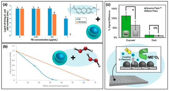 Another system for enhanced APDT is shown in Figure 9c. Rather than employing a co-administration strategy, this platform takes advantage of through-space fluorophore-plasmon interactions to amplify the generation of reactive oxygen species. This amplification platform has its mechanistic basis in metal-enhanced fluorescence (MEF), whereby a plasmonic metal substrate can act as a “nanoantennae” for excitation light; the resulting field generated by the substrate may then excite larger populations of fluorophores in the near-field than would be possible under classical conditions. This effectively expands the absorption cross-section well beyond what would be possible for the fluorophore alone and is known as the enhanced absorption mechanism. MEF may also occur as a result of enhanced emission pathways, where fluorophore quanta couple to the nanoparticle plasmons such that the whole entity radiates as a unit []. MEF, and even metal-enhanced phosphorescence (MEP), from carbon dots on silvered substrates have been previously reported by our lab [,]. However, the enhancement of radiative emission could actually run counter to the metal enhancement of ROS (ME-ROS), as radiative decay versus ROS generation are competitive decay pathways for excited carbon dots. Nonetheless, ME-ROS has been detected for small molecule photosensitizers, potentially via enhanced absorption, yielding ME1O2 [,] and MEO2•− [,]. In a recent study by our lab, ME1O2 was also detected from carbon dots on silvered substrates, shown in Figure 9c []. This enhancement was detected using the fluorescence-on probe Singlet Oxygen Sensor Green™ and is reported as a function of percent signal difference, that is, the difference or increase between the final probe fluorescence intensity after photosensitization and its initial intensity. This analysis was conducted for photosensitization exposure conditions contained both in the silvered wells or in a blank well plate as a classical control. Fluorescence detection for all samples was performed in a blank 96-well plate. The results demonstrate a greater signal increase for the silvered exposed wells than detected for the blank plate; both plates yielded statistically similar “dark” results, confirming ME1O2. This technology remains to be further refined and tuned, with a vast array of metal substrates available to optimize the enhanced absorption rather than emission coupling mechanism for carbon dots in ME-ROS systems; however, these results do in fact reveal an additional way that carbon dots may be employed in APDT hybrid systems. This application of a carbon dot/silver nanoparticle hybrid is particularly intriguing, as typically these capitalize primarily on the inherent antibiotic character of the silver particles [,], employing carbon dots instead as either imaging agents [] or as reducing agents in the initial silver particle synthesis [,,,,].