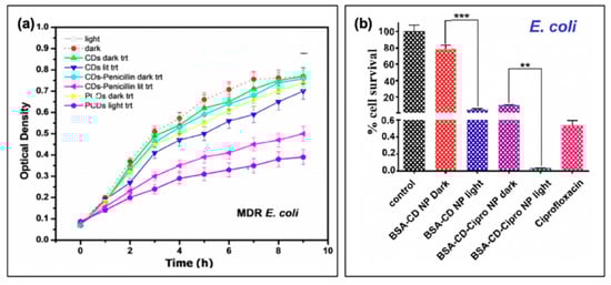 In a study by Mandal et al., BSA-functionalized carbon dot nanoparticles (~350 nm in size, from ~5 nm carbon dots) were subsequently loaded with ciprofloxacin; the results of this are presented in Figure 10b for E. coli []. Inclusion of the drug was found to improve the dark toxicity, similar to the other discussed reports of antibiotic co-administration, with a slow release of the ciprofloxacin (~80% release after 24 h). With light exposure, further growth reduction was once again observed, in this case for both E. coli and S. aureus, although the survival of S. aureus (0.47%) was more pronounced than that of E. coli (0.03%); this is to a degree to be expected, however, as ciprofloxacin is more effective against E. coli than S. aureus []. Carbon dots have also been incorporated with chitosan for wound healing in rats [], and as ciprofloxacin-conjugated drug carriers []. While these studies also present an excellent foundation for further development, studies into resistant development under these regimes and bacterial resurgence patterns will be beneficial as the field develops.