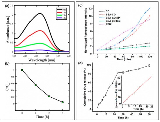 In hybrid systems, added complexity further necessitates careful consideration of potential undesirable interplay between the carbon dot photosensitization effects and whatever agent(s) accompany it in the system. For example, ROS from carbon dots have been reported to cause degradation of dyes as mentioned previously [,,]. An example of this observation is shown in Figure 11a,b, in which methyl orange (MO) is significantly degraded by photoactivated carbon dots []. It should be noted that in this case, the carbon dots were also administered with hydrogen peroxide with the aim of photocatalytic degradation of the dye; however, the oxidative effects from even carbon dots alone could have severe deleterious effects on organic small molecules that have been incorporated as an essential part of the system. This interaction will be highly variable from system to system, dependent upon the photosensitizing characteristics of the employed carbon dots and the small molecule of interest and should be characterized in emerging studies of this nature. Another practical consideration for hybrid systems regards optimizing the timescale for drug release; as shown in Figure 11c,d for the ciprofloxacin-loaded BSA-CD nanoparticles, the timescales of ROS generation and drug release are not particularly comparable []. Whereas ROS generation was monitored on the scale of 0 to 120 min, 80% ciprofloxacin release was only achieved by 24 h. The measurement interval of the former was ~10 min, the latter was measured approximately every 2 h. It should come as no surprise that when combining drugs and photosensitization, the order in which antibacterial mechanisms will begin to act upon the cells must be considered. While this is in itself a challenge, it also provides an opportunity to understand how first weakening cells via one mechanism or the other could potentially improve the response of the secondary mechanism. Conversely, it may be found through future investigation that in some cases, simultaneous mechanistic timing is required. Nonetheless, administration timelines must be considered and tuned when optimizing carbon dot-based antibacterial dual-mechanism hybrid systems.