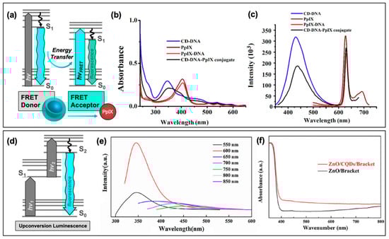 Carbon nanodots in photodynamic hybrid systems, including (a–c) fluorescence resonance energy transfer (FRET) and (d–f) up-conversion luminescence. (a) Modified Jablonski diagram demonstrating FRET between a donor (carbon dots) and acceptor (example: protoporphyrin IX, PpIX) molecule. (b) Absorption and (c) fluorescence emission spectra of DNA-functionalized carbon dots (CD-DNA), protoporphyrin IX (PpIX-DNA), and the hybridized form (CD-DNA-PpIX conjugate). These display the spectral overlap between FRET donor (CD-DNA) fluorescence and acceptor (PpIX) absorption. (d) Modified Jablonski diagram demonstrating a basic up-conversion process from two excitation events. (e) Excitation-dependent up-conversion fluorescence from carbon nanodots (CQDs) at varying excitation wavelengths. (f) Absorption increase of hybrid system (ZnO/CQDs/Bracket) relative to control (ZnO/Bracket). For additional details regarding the reported studies, the reader is referred to Table 2 of the main text. Permissions: (b,c) Reprinted from Journal of Colloid and Interface Science, 533, Kumari, S. et al., “Carbon dot-DNA-protoporphyrin hybrid hydrogel for sustained photoinduced antimicrobial activity”, 228–238, Copyright © 2020, with permission from Elsevier []. (e,f) Reprinted from Chemical Physics Letters, 706, Zhang, J. et al., “Enhanced antibacterial properties of the bracket under natural light via decoration with ZnO/carbon quantum dots composite coating”, 702–707, Copyright © 2018, with permission from Elsevier [].