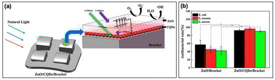 - Zhang, J.; An, X.; Li, X.; Liao, X.; Nie, Y.; Fan, Z. Enhanced antibacterial properties of the bracket under natural light via decoration with ZnO/carbon quantum dots composite coating. Chem. Phys. Lett. 2018, 706, 702–707. [Google Scholar] [CrossRef]