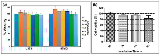 In both APDT and photocatalytic disinfection applications there is potential for contact between mammalian cells or tissues and the agents of photosensitization. For APDT in particular this is an inevitable aspect, as treatments are applied once infections have already taken hold in the patient. In terms of photocatalytic disinfection, however, this is a no less important consideration. Although for many future developed disinfection materials the carbon dot systems might be fixed and stable, it is also possible that solution-based reagents for disinfection may constitute an application strategy for these nanoparticles. Solution-bound agents, unfixed to a solid substrate, thus have a higher chance of transferring from surfaces to biological systems, thereby presenting a potential health challenge. To date, carbon nanodots have been investigated for their cytotoxicity to mammalian cells; largely, they are reported as non-toxic at reasonable concentrations both in vitro and in vivo [,,] although they have been identified to trigger off-target responses, such as inflammatory behavior, dependent on structural/chemical properties []. Particularly for the APDT literature for carbon dots, cytotoxicity is only sometimes probed and discussed, with researchers largely citing other carbon dot reports for verification of their benign nature. This is not necessarily adequate, however, due to the extreme variability that is present in carbon dot samples yielded from different labs by different synthetic procedures and purification methods. An example case where the researchers did in fact probe the cytotoxicity in conjunction with APDT effects is presented in Figure 14a.
