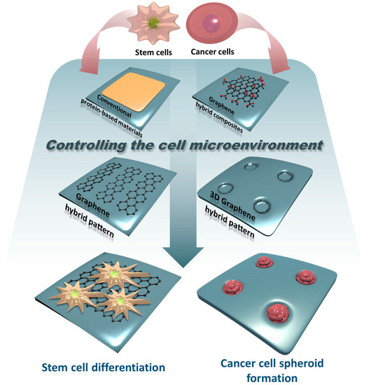 Controlling the cellular environment using graphene is not limited to stem cells. This control can also be applied to tumor cells, as demonstrated in recent studies [108]. As previously mentioned, graphene can induce cell adhesion, so if combined with some biocompatible hydrophobic polymers, a cellular pattern is formed. In particular, studies are being conducted to produce 3D cultures of tumor cells by applying this pattern to tumor cells. Unlike studies on stem cells, numerous studies on tumor cells are specialized in topics such as drug delivery to inhibit/induce growth of tumor cells or regulate growth. Therefore, research has been focused on the development of a 3D cell culture method similar to tumor formation in the human body, and research for improving the efficiency of the culture method is currently underway.