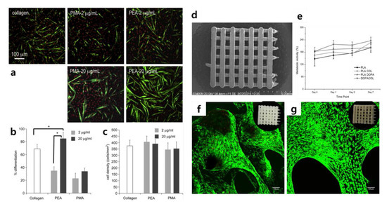 (a) Myogenic differentiation with different conditions. Myosin-positive cells and nuclei are marked in green and red, respectively. (b) Myogenic differentiation and (c) cell density with different FN concentrations. (d) Scanning electron microscopy image of poly(lactic acid) (PLA) scaffolds. (e) Metabolic activity of mesenchymal stem cells (MSCs) cultivated in PLA scaffolds with different coating materials. Results of Alamar Blue assay for cells cultured on (f) PLA scaffolds and (g) DOPA COL scaffolds. (a–c) The reprint of this figure from [54] is permitted by Elsevier. (d–g) The reprint of this figure from [55] is permitted by John Wiley and Sons.