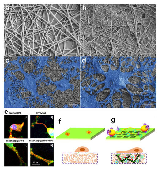 Scanning electron microscopy images of (a) polycaprolactone (PCL) nanofibers, (b) PCL nanofibers coated with graphene oxide (GO), (c) differentiated neural stem cells (NSCs) on PCL nanofibers, and (d) differentiated cells on graphene–nanofiber hybrid scaffolds. Scale bars: 2 μm. (e) Focal adhesion development in PC12 cells on four types of substrate. Schematic illustration of cellular behavior on (f) neutral OPF hydrogel and (g) reduced graphene oxide acrylate (rGOa)CNTpega-oligo (poly(ethylene glycol) fumarate) (OPF)-2-(methacryloyloxy)ethyltrimethylammonium chloride (MTAC) hydrogel. (a–d) The reprint of this figure from [69] is permitted by John Wiley and Sons. (e–g) The reprint of this figure from [77] is permitted by the American Chemical Society.