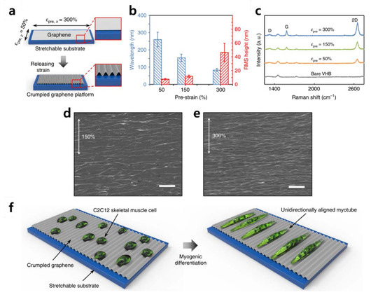 (a) Schematic illustration of fabricating the crumpled graphene. (b) Wavelength and root mean square height of crumpled graphene substrates. (c) Raman spectroscopy intensity of the crumpled graphene on VHB substrates by condition. (d–e) Scanning electron microscopy images of crumpled graphene fabricated from 150% and 300% prestrains. Scale bars: 1 μm. (f) Schematic illustrations of the myogenic differentiation of C2C12 cells on crumpled graphene. The reprint of this figure from [84] is permitted by Springer Nature.