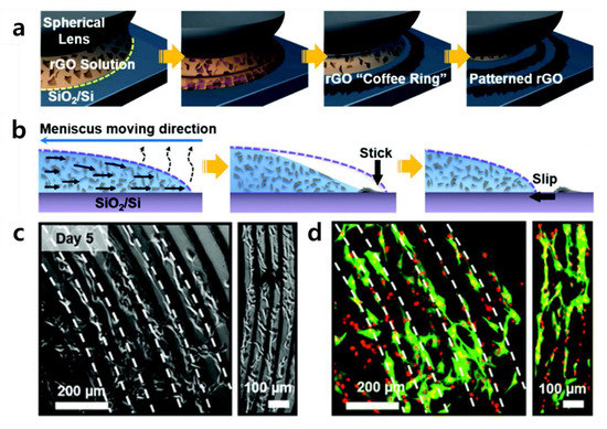 - Kang, S.H.; Shin, Y.C.; Hwang, E.Y.; Lee, J.H.; Kim, C.-S.; Lin, Z.; Hur, S.H.; Han, D.-W.; Hong, S.W. Engineered “coffee-rings” of reduced graphene oxide as ultrathin contact guidance to enable patterning of living cells. Mater. Horiz. 2019, 6, 1066–1079. [Google Scholar] [CrossRef]