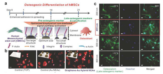 (a) Schematic illustration of osteogenic differentiation of human mesenchymal stem cells (hMSCs) on the graphene-Au hybrid NEAs. (b) Fluorescence images of hMSCs on TCP, Au NEAs, and graphene–Au hybrid NEAs substrate. (c) Fluorescence images of hMSCs differentiated into osteoblasts. Scale bar: 50 µm. The reprint of this figure from [98] is permitted by John Wiley and Sons.