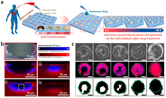 The characterization of the vertically coated graphene oxide micropattern (vGO-MP) platform. (a) Schematic illustration showing cancer cell spheroid formation on vGO-MP and anticancer drug screening process of cancer spheroids on the vGO-MP. (b) Raman mapping images of micro-well cross-section by focal point. (c) Optical microscopic images (top row), fluorescence images (middle row), and computer-based binary images (bottom row) of a HepG2 spheroid in a vGO-MP. Scale bars: 50 μm. The reprint of this figure from [109] is permitted by John Wiley and Sons.
