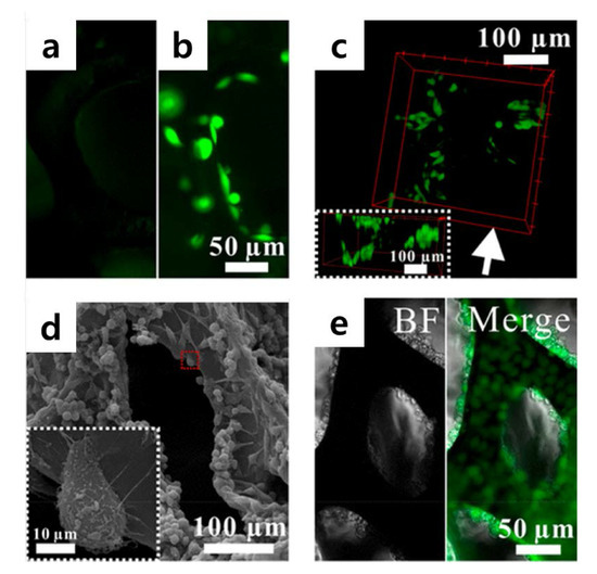 (a) Fluorescence images of GFP-HeLa cells cultured on (a) GF, (b) GF/ phenylboronic acid (PBA)/3-aminophenylboronic acid (APBA), and (c) GF/PBA/APBA composites. (d) SEM images of HeLa cells cultured on GF/PBA/APBA composites. The enlarged image of the red rectangle area is shown in a white square. (e) Microscopic images of HeLa cells cultured for 11 days. The bright field (BF) and the merger of the bright field and fluorescence field (Merge) images are presented. The reprint of this figure from [115] is permitted by the American Chemical Society. (APBA), and (PBA).