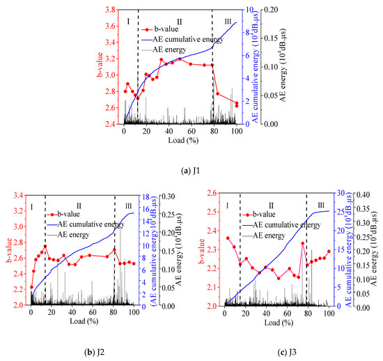 According to the variation law of AE energy and b-value, along with load grade, the damage and destruction process of concrete is divided into three stages. The stage division is shown in Figure 4.