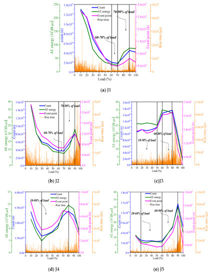 When the load level is 10–60%, the growth rate of the count, AE energy, and number of event points decrease, the rise time decreases, the AE activity gradually decreases from the initial maximum, and the microcrack growth rate slows down. When the load level is 60–70%, the increase of count, AE energy, and number of event points is relatively stable, AE activity is stable, and microcrack expansion is stable. When the load level is 70–90%, the increase of count, AE energy, and number of event points is rapid, and the crack rapidly expands. When the load level is 90–100%, the increase of count, AE energy, and number of event points is low; when the rise time increases, the microcracks gather to form macrocracks, the AE activity decreases, and at this time, the concrete fails. In J3, when the load level is 10–50% and 60–80%, the count, AE energy, number of event points, and rise time increase evenly, the AE activity is stable, and the microcracks expand steadily. When the load level is 50–60%, the count, AE energy, and number of event points increase rapidly, the AE phenomenon is active, and the microcracks expand rapidly. When the load level is 80–100%, the increase rate of the count, AE energy, and number of event points decreases, the AE activity decreases, and concrete damage occurs. Through the comparative analysis of J2 and J3, after the basalt fiber is added, the cracking of fully recycled concrete is stable in the early stage, but in the late damage process, the peak value rises earlier, and the failure of concrete occurs earlier.