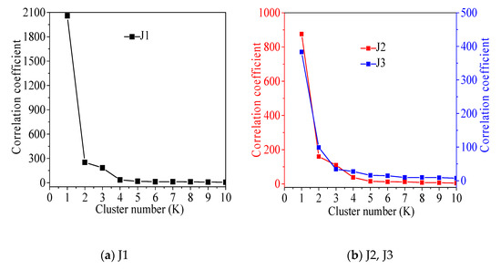 The amplitude and peak frequency of AE are used as the parameters of cluster analysis, and the system clustering method in IBM SPSS Statistics 24 is adopted to obtain the optimal clustering number according to the relationship between the clustering correlation coefficient and the number of categories. The first obvious inflection point appears, and the curve gradually flattens, so this point can be selected as the optimal clustering number. According to Figure 6, the optimal number of clusters in J1, J2, J4, and J6 concrete is 2; the optimal number of clusters in J3, J5 and J7 concrete is 3.