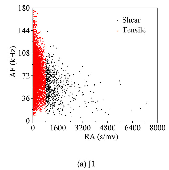 RA is defined as the ratio of rising time to amplitude in μs/V, as shown in Formula (2), and AF is defined as the ratio of ringing count to duration in kHz, as shown in Formula (3). There are differences between RA and AF values in shear damage and tensile damage. In tensile damage mode, due to the release of energy, the related AF values will be higher. Conversely, RA values associated with shear damage patterns are higher due to longer rise time and duration. The unit of amplitude in the original AE data of this test is (dB), which needs to be converted to (V). The conversion formula is shown in Formula (4).