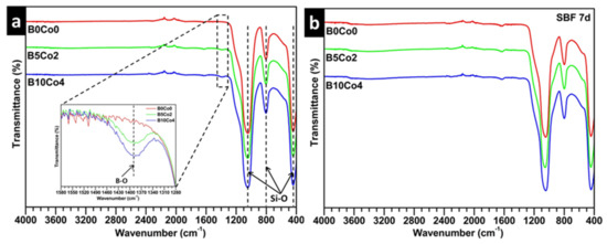 Figure 2a shows the FTIR spectra of the BCo.BGNs. The peaks at 443 and 803 cm−1 and the broad-band in the 1100–900 cm−1 range are attributed to the bending and stretching vibrations of Si–O–Si bonds [46,47]. The peak at 1388 cm−1 represents the B–O stretching vibration of trigonal (BO3) [48]. The relative intensity of this peak increased with the increase of B content. The spectra of the BCo.BGNs after immersion in SBF for 7 days (Figure 2b) do not show any difference compared with those of the BCo.BGNs before immersion in SBF. The peaks related to phosphate cannot be identified in the spectra. The result is consistent with SEM observations after a 7-day immersion period in SBF (Figure 1).