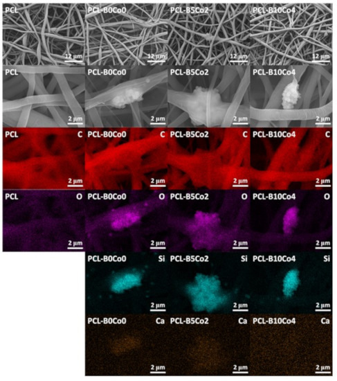 Figure 4 shows SEM images and EDX element maps of the PCL-BCo.BGNs mats. All samples exhibit fibrillary morphology without beads. Only a few fibers in the PCL-B0Co0 sample were seen to fuse together. In Table 3, the average fiber diameter is shown, indicating that PCL-B0Co0 mats had smaller diameter than the other samples. The standard deviation and minimum/maximum fiber diameter show a wide distribution of fiber diameters, which can also be observed in Figure 4. The Young’s modulus of PCL-B0Co0 was lower than the one of the other samples. In the EDX analysis (Figure 4), the carbon map clearly indicates the PCL component in the composite fibers, while the silicon map shows the aggregated and dispersed nanoparticles. Oxygen is present in both PCL and bioactive glasses, showing the profiles of both the fibers and nanoparticles. Enrichment of calcium is observed in the region where the nanoparticles were aggregated, except in PCL-B10Co4, which is consistent with the significantly lower calcium content in this sample in comparison to PCL-B0Co0 and PCL-B5Co2 mats, as reported in Table 2. The last column of Table 3 shows the water contact angle results indicating the wettability of PCL-BCo.BGNs mats. The contact angles of all samples, which are around 134°–143°, did not show significant differences and confirm a hydrophobic behavior. It should be mentioned that even if some agglomeration of particles was detected, a surface modification of nanoparticles (that could possibly improve their distribution in the solution), was not considered, as such particle surface modification could introduce toxic remnants in the fibers.