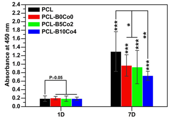 WST-8 results from cell culture experiments with ST-2 cells directly cultured on PCL-BCo.BGNs mats for 1 and 7 days (0.01 < *P < 0.05, 0.001 < **P < 0.01, ***P < 0.001, mean ± SD, N = 9).