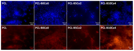 Cell viability (WST-8) results are shown in Figure 5. The data does not show any significant difference in the viability of cells cultivated on the PCL-BCo.BGNs mats at 1 day. After 7 days, the viability of all samples was significantly higher than after 1 day. The cells cultivated on PCL fiber mats possessed the highest viability, while cells cultivated on PCL-B10Co4 mats exhibited the lowest viability. Figure 6 shows the DAPI and rhodamine phalloidin fluorescent images of ST-2 cells 7 days after seeding. DAPI and rhodamine stained cell nuclei and cytoskeleton with blue and red fluorescence, respectively. The fluorescent images indicate that the ST-2 cells indeed infiltrated into the PCL-BCo.BGNs mats.