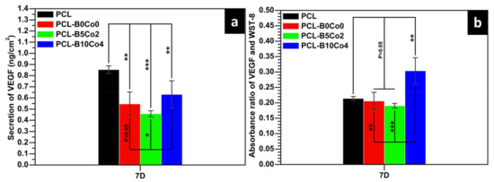 The total VEGF secretion from ST-2 cells cultivated on the fiber mats after 7 days is shown in Figure 7a. Cells cultivated on neat PCL showed the highest value of total VEGF secretion. The VEGF secretion of cells seeded on PCL-B10Co4 was higher than that on PCL-B0Co0 and PCL-B5Co2. To properly evaluate the results obtained from total VEGF secretion, it is possible to analyze the absorbance ratio of VEGF and WST-8, which reflects the secretion of VEGF per unit number of cells [33], and it is shown in Figure 7b. The PCL-B10Co4 sample showed the highest secretion of VEGF per unit number of cells. In addition, the concentrations of Si, B and Co released by PCL-BCo.BGNs mats after 7–day cultivation are shown in Table 4. The concentrations of ions released from PCL-BCo.BGNs mats are seen to be lower than those of neat BCo.BGNs. B could not be detected in the culture medium of PCL-B5Co2, which is consistent with the B release behavior of BCo.BGNs. However, both B and Co were detected in the culture medium of PCL-B10Co4. These results indicate that PCL-BCo.BGNs mats with a high content of B and Co may exhibit a synergistic effect of the two ions, leading to the increase of VEGF secretion from ST-2 cells after 1 week of cell culture.