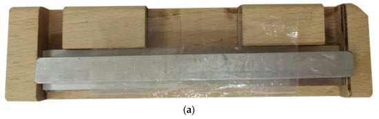 The stand consists of a wooden base (4) with dividers (1–3) and single parts of the specimen located between them (5,6) (Figure 9). The wooden base is used for the appropriate placement of the specimen. Moving single parts of the specimens toward particular surfaces on the base prevents their displacement in relation to each other and provides the adhesive single-lap joint with a repeatable dimension. The application of two dividers made of poly(tetrafluoroethylene) prevents adhesion of the specimen to the elements of the stand. Foil covers dividers 1 and 3 to provide an additional protective element. The thickness of dividers 2 and 3 determines the thickness of the adhesive joint. After the adhesion process, a clamp was added to the central point of the joint.