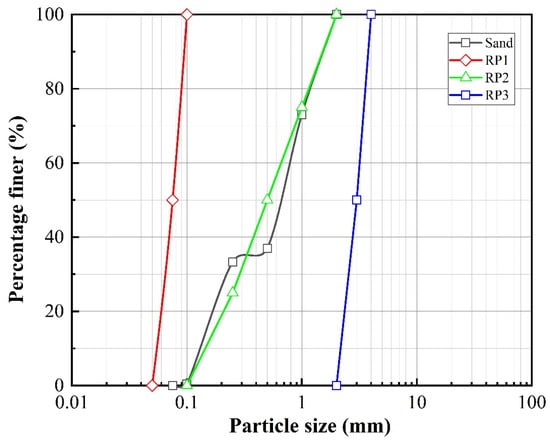Xiamen standard sand with grain sizes from 0.075 mm to 2 mm was used as the host soil to prepare the sand–rubber mixtures in these tests. The waste rubber particles (RP) were provided by a local company specializing in the decomposition of waste rubber tires. After screening, rubber particles sized from 0.05 mm to 4 mm were selected and classified as rubber particles according to ASTM D6270-17 [34]. In order to study the influence of rubber grain size on the dynamic response of the sand–rubber mixtures, the rubber particles were divided into three different grain size ranges: RP1, with a particle size distribution of 0.05–0.1 mm, RP2, with a particle size distribution of 0.1–2 mm, and RP3, with a particle size distribution of 2–4 mm. The particle size distribution curves of the sand and rubber particles are shown in Figure 1, and their main physical properties are provided in Table 1.