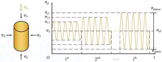 First, a minimal confining pressure was applied to the specimen and CO2 gas was passed through it for at least 30 min to facilitate the saturation process. Then, the specimen was saturated with de-aired water and back pressure until the pore pressure coefficient (B-value) increased to greater than 0.95. Next, isotropic pressure consolidation was conducted according to the target mean effective confining pressures (50 kPa, 100 kPa, 150 kPa, and 200 kPa) by controlling the radial stress applied to the inner and outer side walls of the specimen as well as the applied axial stress. It should be noted that if the volume of the back pressure in the specimen remained stable for 5 min after closing the drainage valve, the consolidation was considered to have been completed. Following the consolidation process, the specimen was subjected to stress-controlled cyclic triaxial testing under undrained conditions using a sine wave loading pattern that increased stepwise in amplitude to determine its dynamic parameters. As per ASTM D3999 [37], the cyclic testing was carried out under various axial stress at a loading frequency of 1 Hz until the axial strain exceeded a maximum closure error of 0.2%.