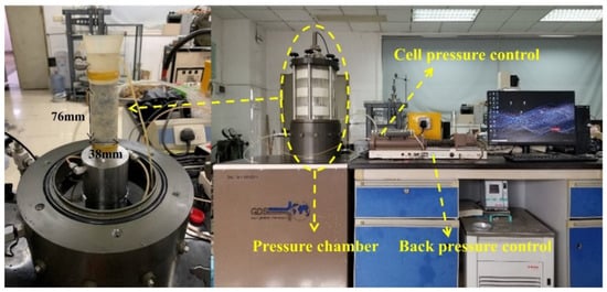 As shown in the multistage cyclic axial loading diagram in Figure 2, all specimens were subjected to five loading cycles in each cyclic loading level. A total of 50 data points were collected for each sinusoidal cycle. The experimental program employed in the current study is summarized in Table 2. Figure 3 shows photographs of the sample diagram and experimental apparatus. It should be noted that according to ASTM D3999 [37], after the completion of each loading step and before moving on to the next higher cyclic load, the specimen drainage valves were opened to re-establish the effective consolidation stress before re-closing them to again impose undrained conditions.