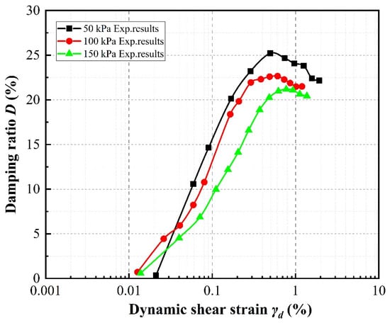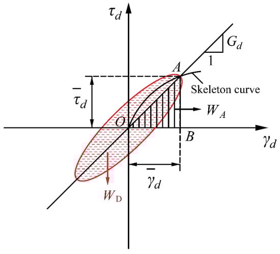 The damping ratio is an important dynamic parameter of a soil that expresses the hysteresis characteristics of its stress–strain behavior under cyclic loading. It also reflects the dissipation of energy. As can be seen from the Figure 5, the damping ratio λ can be defined with Equation (8) according to Hardin and Drmevich [39].