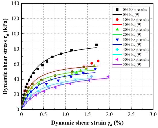 Figure 7 indicates that the rubber particle size also affects the dynamic diaphysis curve. Taking the case of 20% rubber volume content under a confining pressure of 100 kPa as an example, an increase in particle size leads to an upward shift in the dynamic diaphysis curve. Thus, the shear stress increases dramatically with increasing rubber particle size under a confining pressure of 100 kPa.
