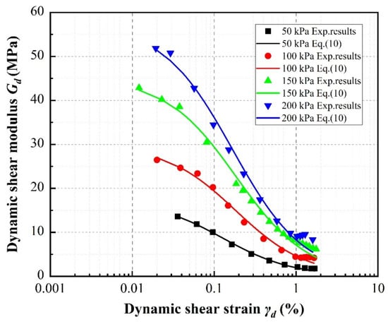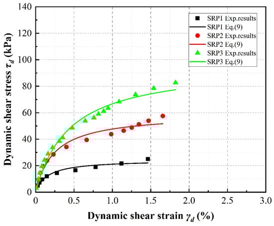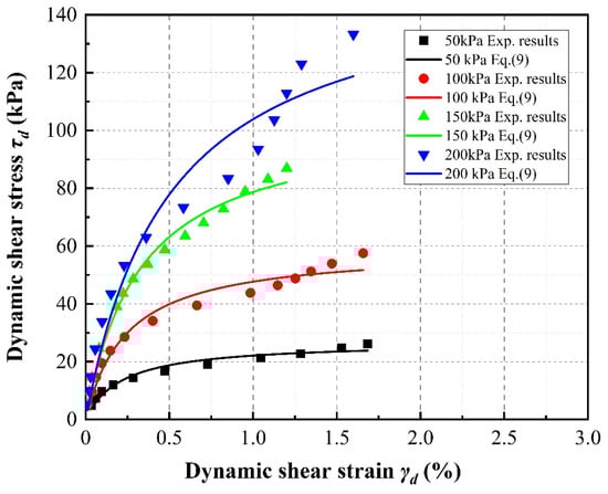 Figure 6, Figure 7 and Figure 8 present the dynamic diaphysis curve, which can be obtained by the connecting peaks of the shear stress–strain hysteresis loops for different loading steps. Generally, all specimens exhibit strain-hardening behavior under these stress-controlled consolidated undrained triaxial tests; that is, the maximum dynamic shear stress is observed at a large strain. The general trend observed in these figures appears to follow the well-known hyperbolic law. It can also be observed that, at shear strain amplitudes less than about 0.5%, the dynamic shear stress increases and the dynamic shear strain is nearly constant, exhibiting only a slight increase, whereas the shear strain increases obviously at shear strain amplitudes higher than about 0.5%.