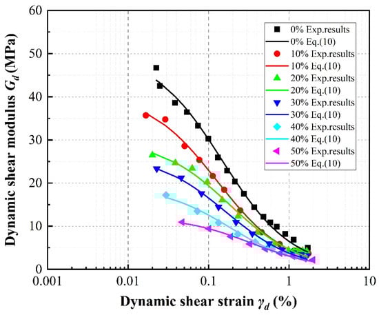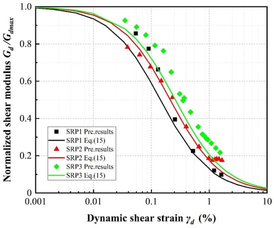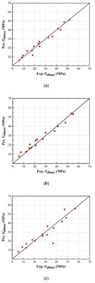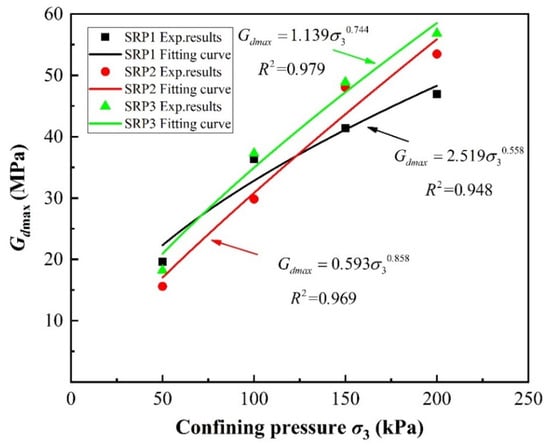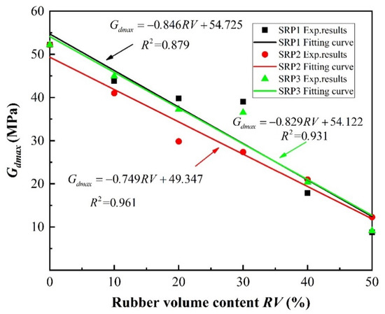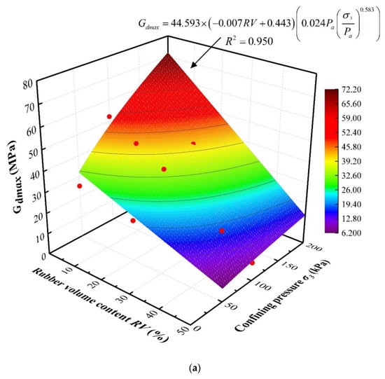 Equations (13) and (15) indicate that the maximum dynamic shear modulus is an important parameter in the calculation of the reference shear strain and normalized shear modulus, both of which play an important role in the design and evaluation of sand–rubber mixtures. Thus, a comprehensive function describing the maximum shear modulus Gdmax of a sand–rubber mixture according to rubber volume content RV and confining pressure σ3 was obtained by considering the experimental data using the multiple regression analysis method as follows: