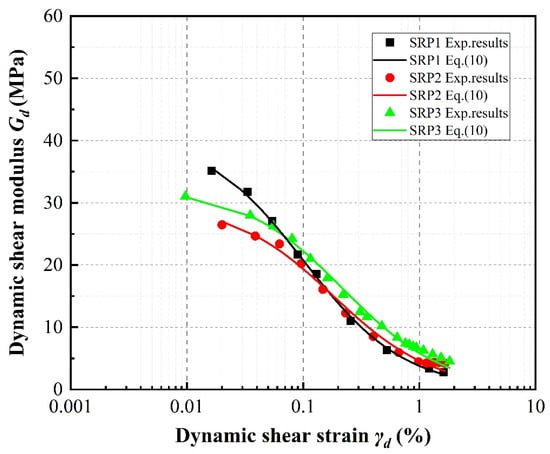 Thus, it can be determined from Equations (14) and (15) that the dynamic shear modulus of a sand–rubber mixture is a function of the dynamic shear strain.