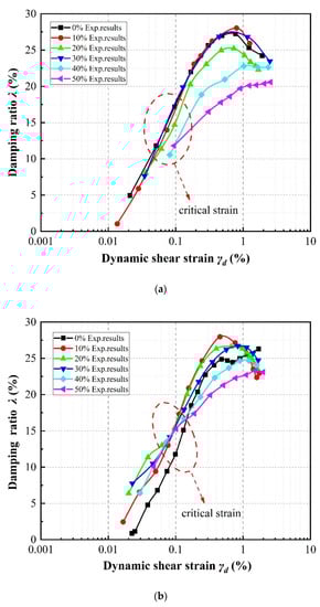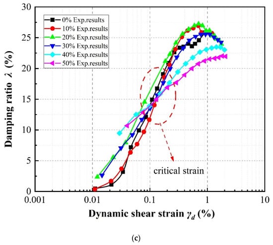Figure 12 indicates that, taking the case of SRP2 as an example, the damping ratio initially increases with increasing rubber volume content. This also can be observed in the results of Ehsani et al. [42], and is similar to the results of Sarajpoor et al. [7] and Senetakis et al. [21] as previously mentioned. Note that the damping ratio exhibits a strong dependence on the rubber particle size, and shows an optimal value at a specific rubber volume content. For SRP2, the optimal rubber volume content at which the mixture damping ratio is higher than that of pure sand is about 20% to 30%, while in the case of SRP1 (not pictured) the optimal rubber volume content is about 10% to 20%, but for SRP3 (also not pictured), the damping ratio is always lower than that of pure sand. Obviously, the effect of rubber volume content on the damping ratio is influenced by the confining pressure and shear strain. As the rubber volume content increases, the relationship between damping ratio and shear strain tends to remain stable, which indicates a low sensitivity of the damping ratio to variations in shear strain amplitude. It can further be observed in Figure 12b that at shear strain amplitudes less than about 0.1%, a higher rubber volume content leads to a higher damping ratio, whereas at shear strain amplitudes greater than 0.1%, the opposite trend can be observed. The tests conducted at different confining pressure levels further revealed that these critical strain values increase with increasing confining pressure: the critical strain increases from 0.09% to 0.1% to 0.11% for confining pressures of 50 kPa, 100 kPa, and 150 kPa, respectively.